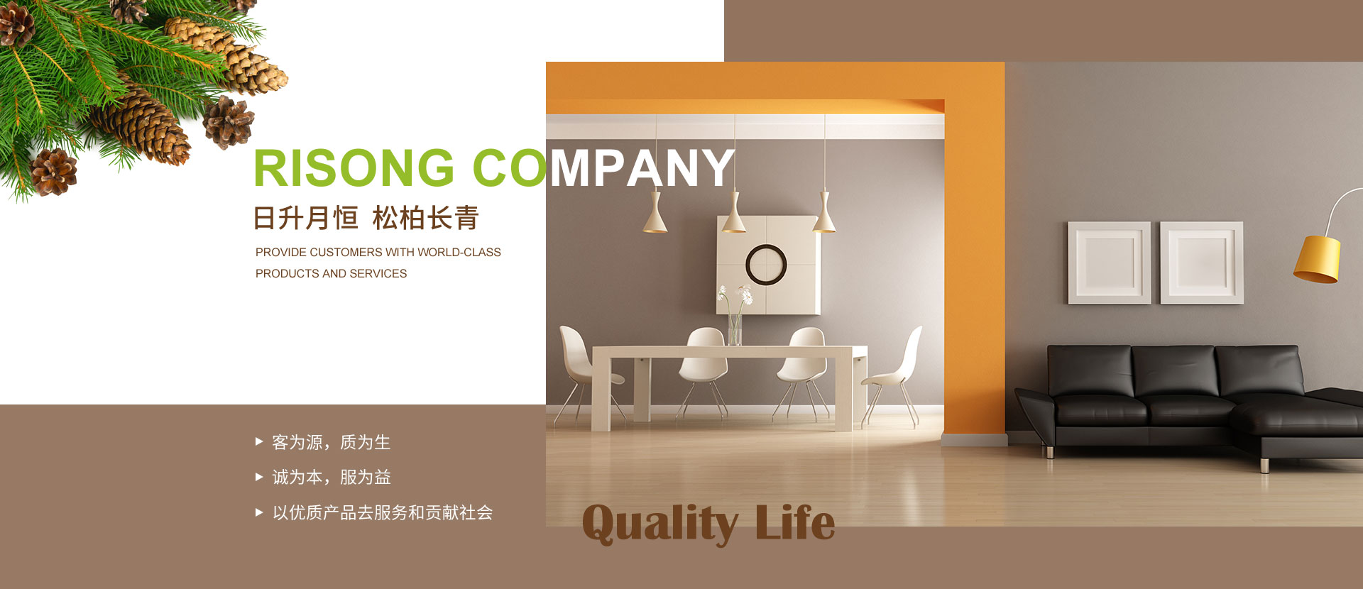 大連日松將一直秉承“以優(yōu)質(zhì)產(chǎn)品去服務(wù)和貢獻(xiàn)社會”的經(jīng)營宗旨;“客為源,質(zhì)為生、誠為本、服為益”的經(jīng)營理念;達(dá)到“使用者、銷售者、制造者”三者并存共榮之經(jīng)營思路;全體日松人將以“熱情、禮貌、快捷、準(zhǔn)確”的行動指南,不懈努力的為每一位客戶,提供行業(yè)內(nèi)一流的高端、環(huán)保、舒適、健康的產(chǎn)品和細(xì)節(jié)服務(wù),打造出適合“您”的優(yōu)質(zhì)家居住宅環(huán)境。